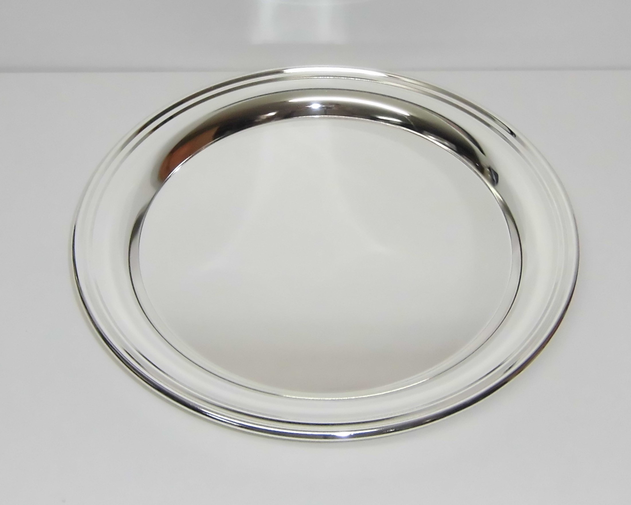 Tablett, versilbert, rund, 25 cm Durchmesser, mit glatter Oberfläche und Fadenrand