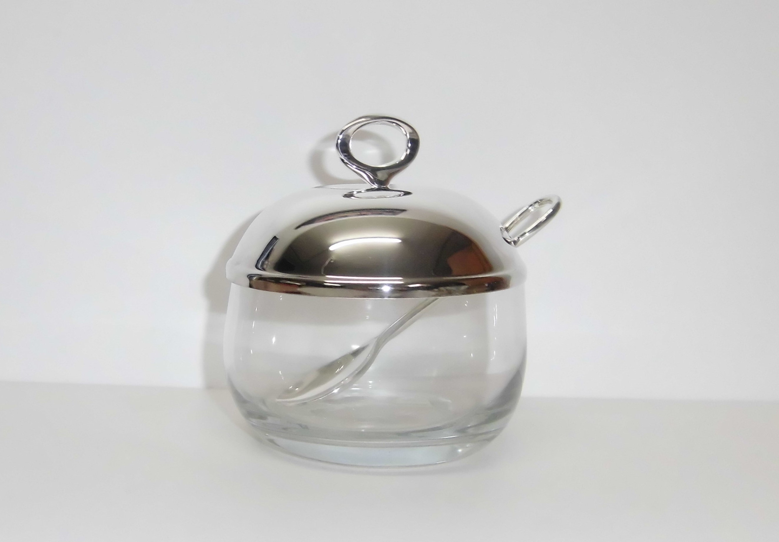 Marmeladendose mit Löffel, versilbert, das Glas ist 6 cm hoch und 9 cm breit