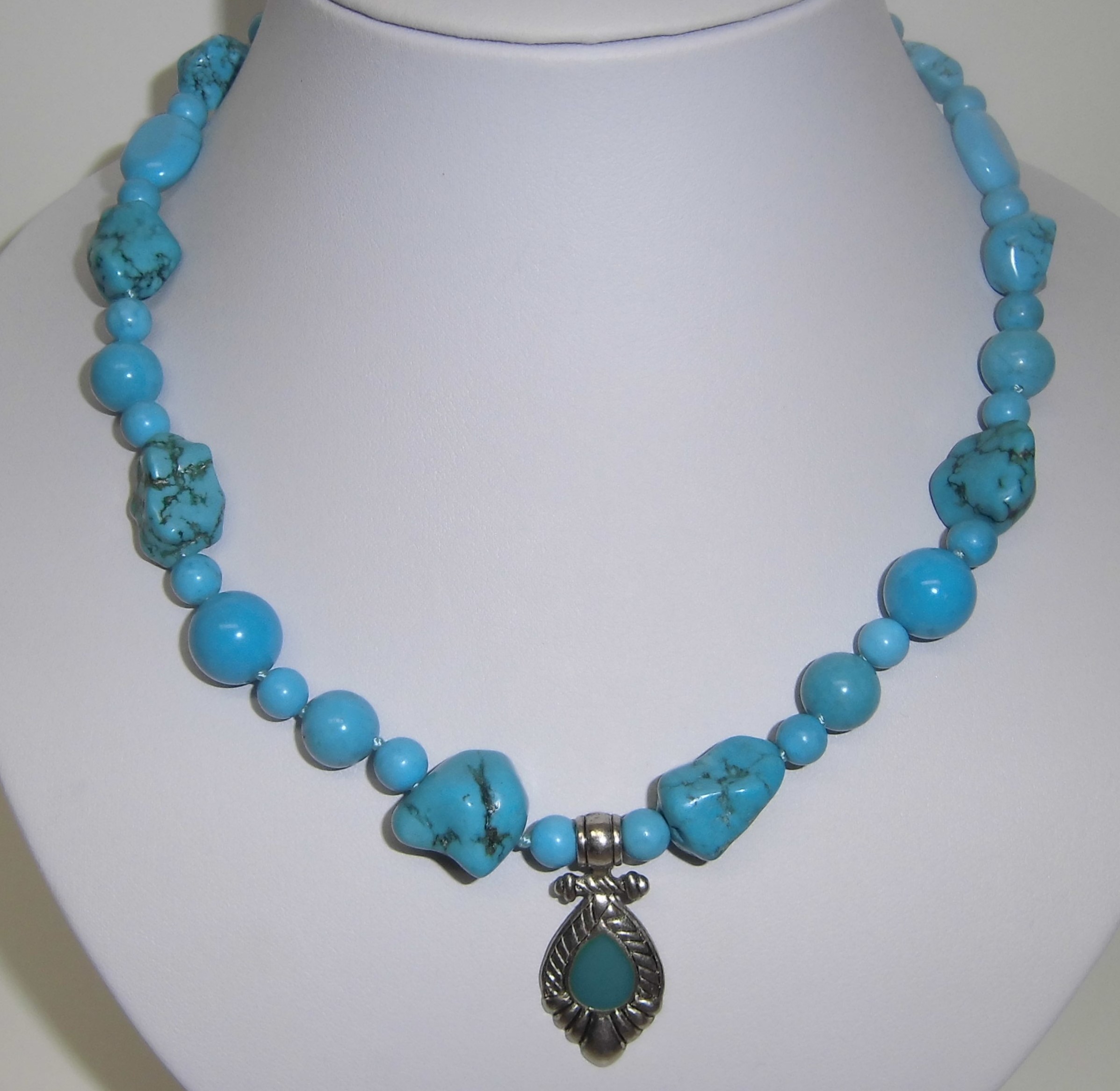 Edelsteinkette mit Anhänger, türkis, 42 cm lang, der Anhänger ist 20 x 15 mm breit, die Kugeln sind 5 bis 10 mm breit, die Steine sind unterschiedlich groß, die Kette hat einen silberfarbigen Karabinerverschluß