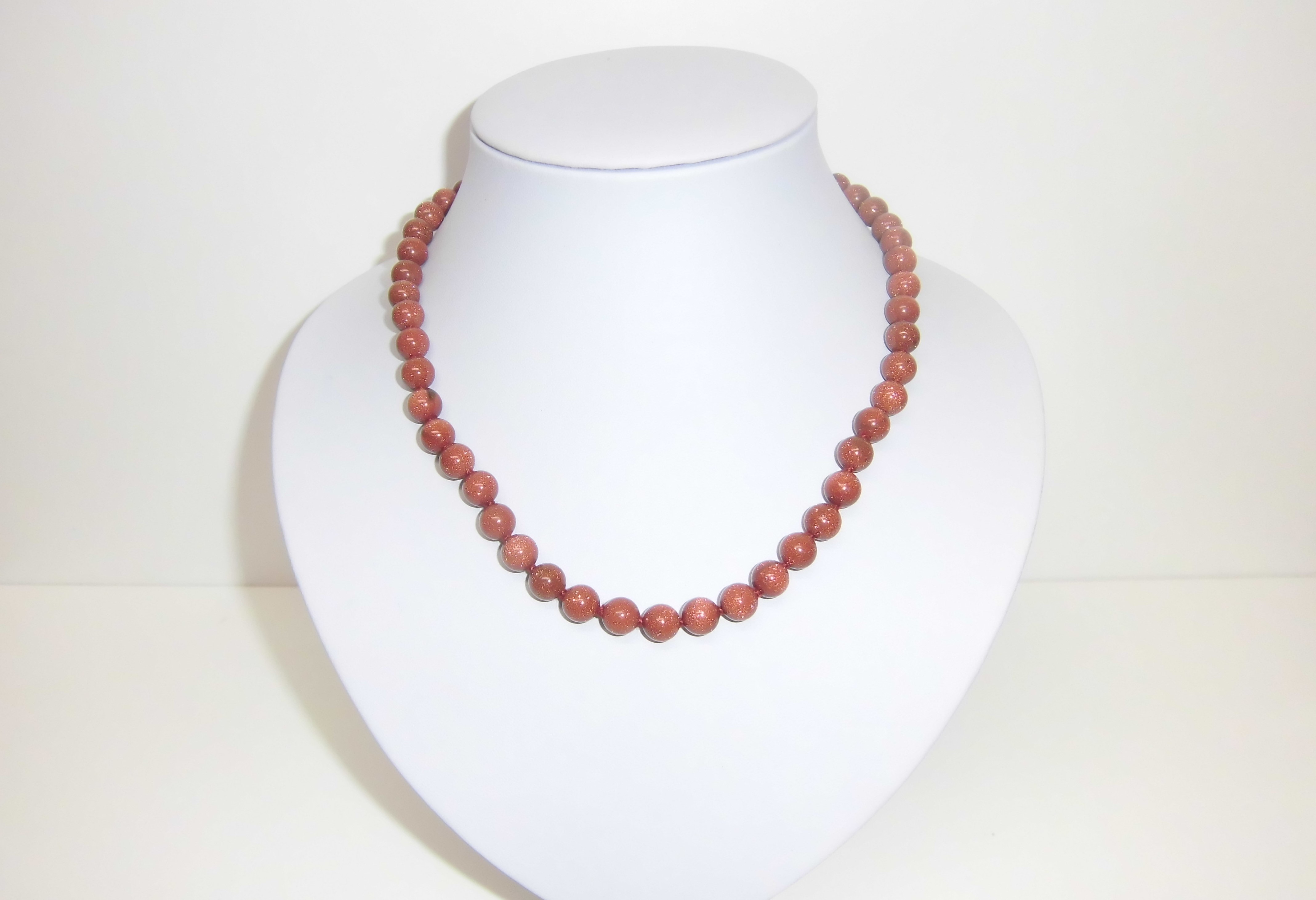 Edelsteinkette Goldfluß, 42 cm lang, die einzeln geknoteten Perlen sind ca. 5 mm breit, die Kette hat einen goldfarbigen Karabinerverschluß