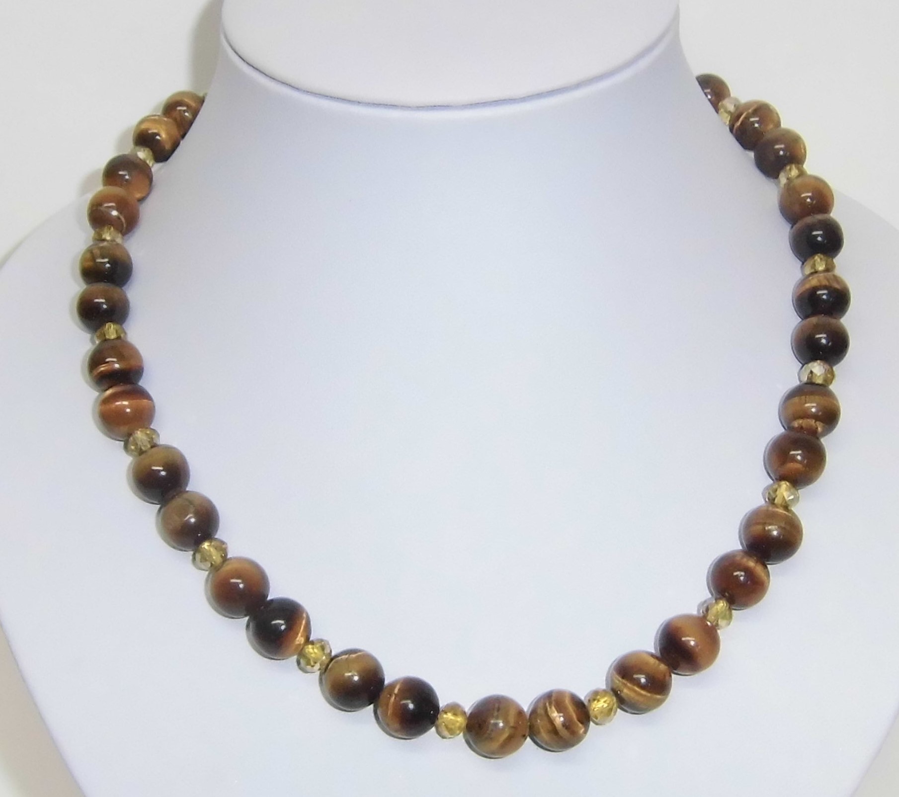 Edelsteinkette Tigerauge mit facettierter goldfarbiger Glasperle, 44 cm lang, die einzelne Perle ist ca. 9 mm breit, die Glasperlen sind ca. 3 mm breit, die Kette hat einen goldfarbigen Karabinerverschluß