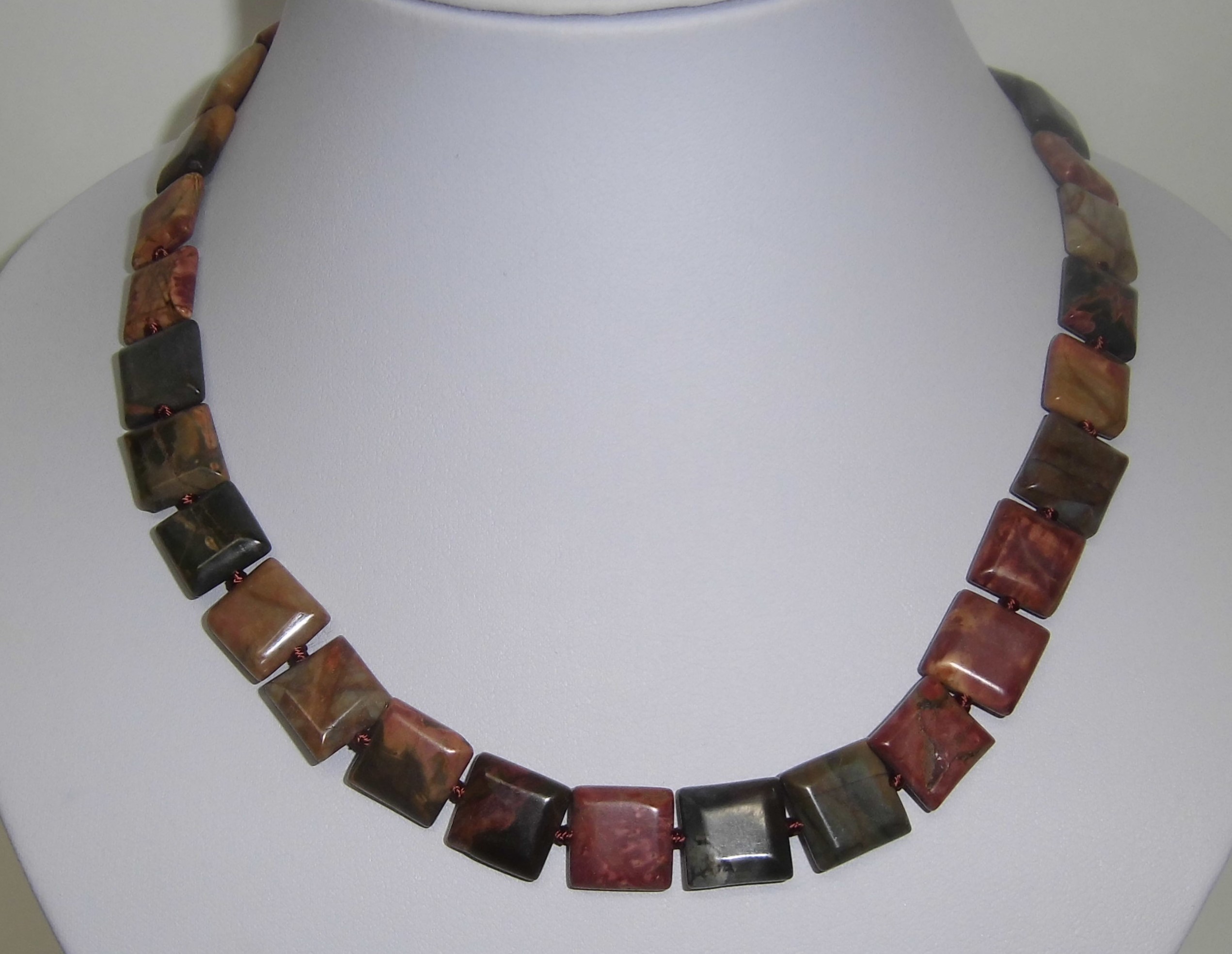 Edelsteinkette Picasso-Jaspis, 44 cm lang, die einzeln geknoteten quadratischen Steine sind 10 x 10 mm breit, die Kette hat einen silberfarbigen Karabinerverschluß