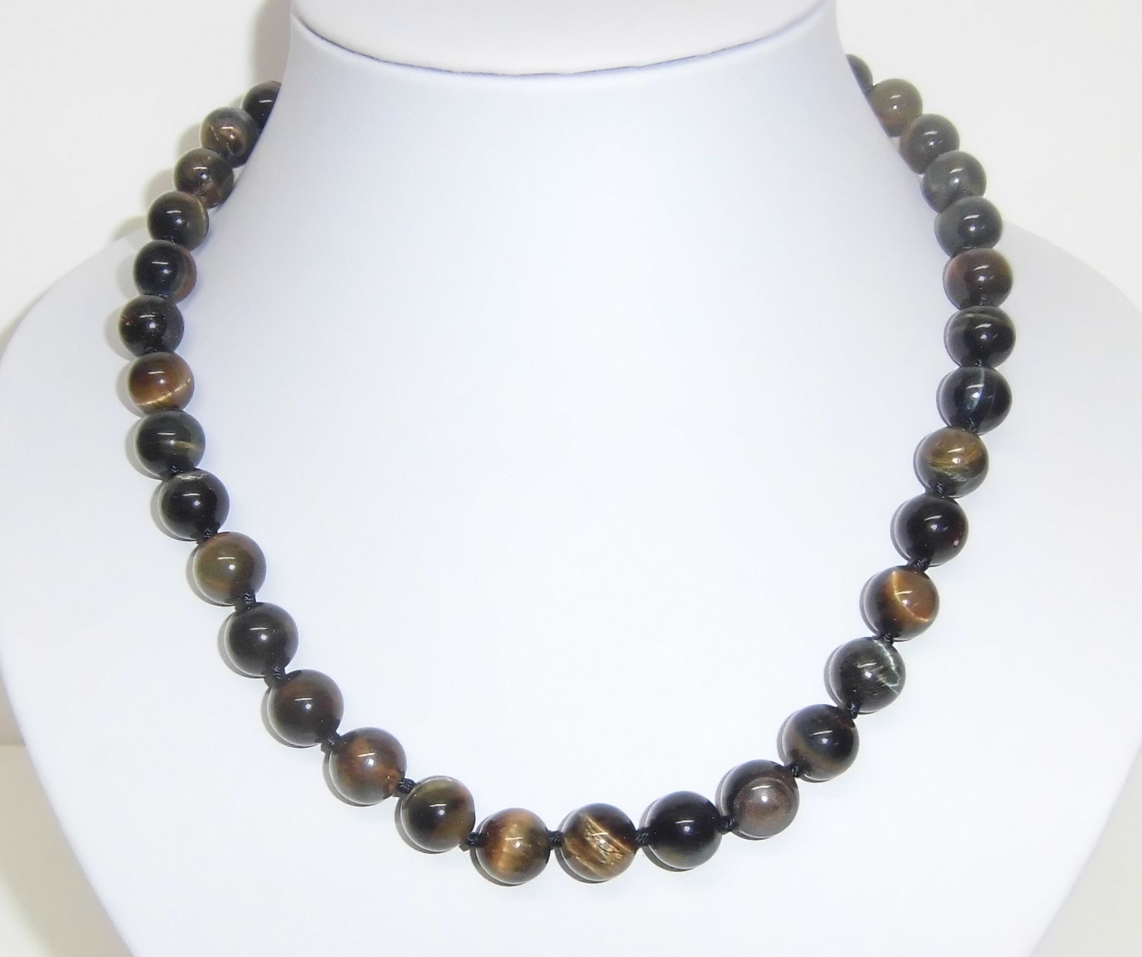 Edelsteinkette Tigerauge, mehrfarbig, 46 cm lang, die Perlen sind einzeln geknotet und ca. 8 mm breit, die Kette hat einen silberfarbigen Karabinerverschluß