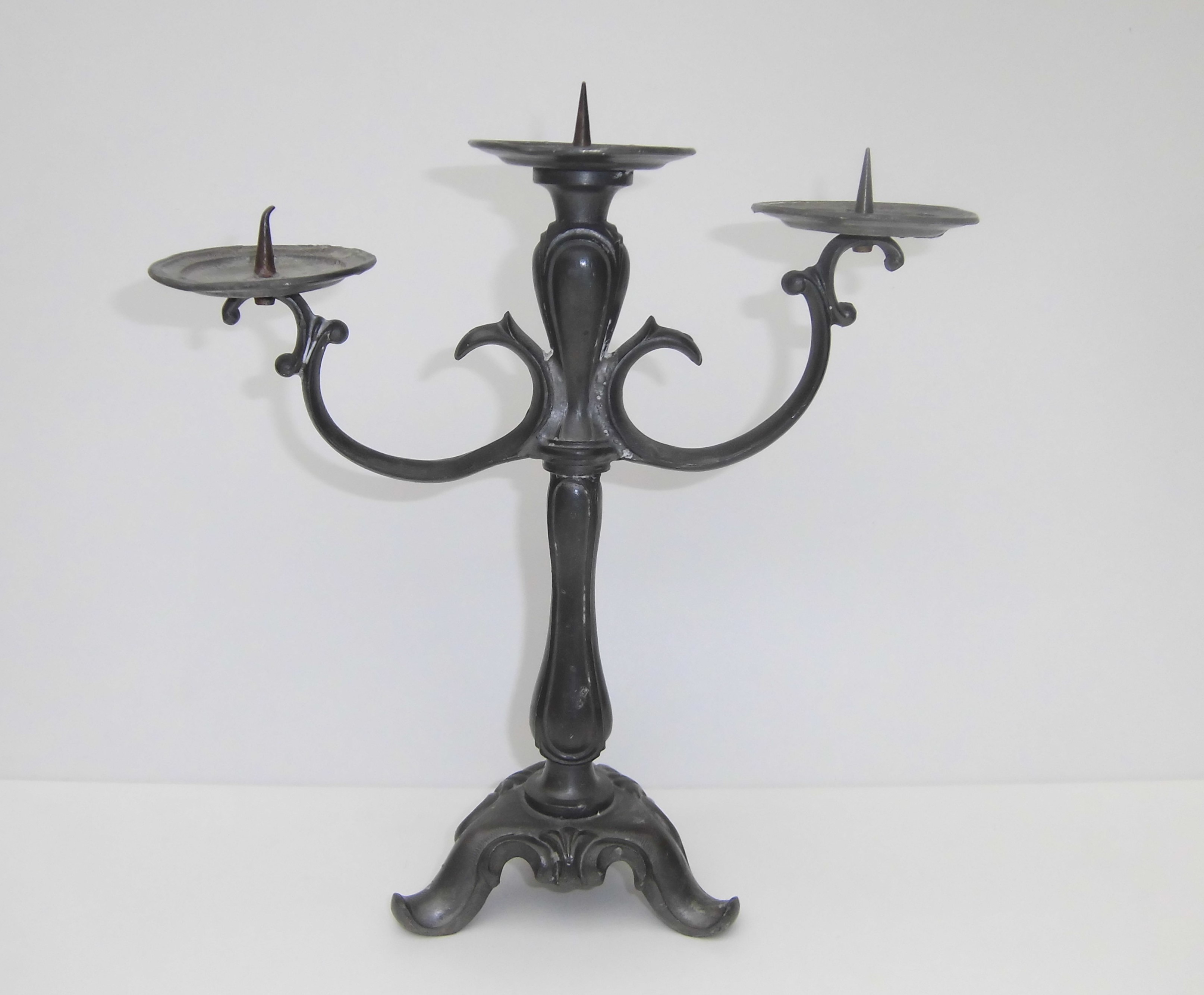 Kerzenleuchter, dreiflammig, Zinn, mit Stempel "Kaiser Zinn", 22 cm hoch, 21 cm breit, 782 Gramm schwer, gebraucht, älter, mit den Gebrauchsspuren der Zeit