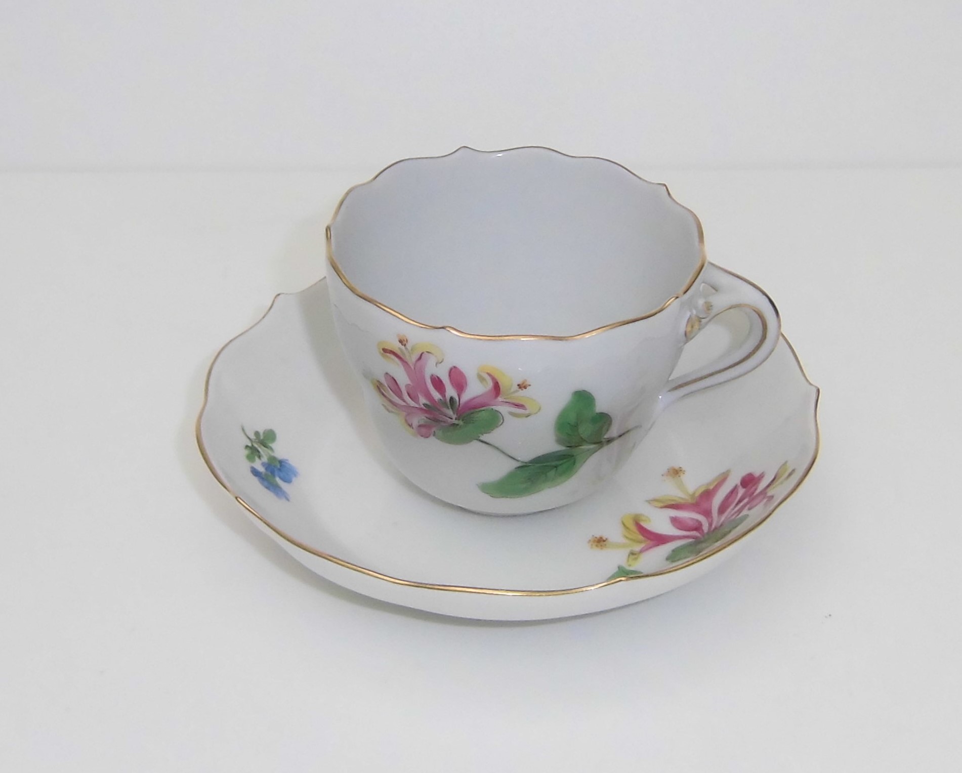 Mokkatasse mit Untertasse, Meissen mit Blumendekor, gebraucht, die Tasse ist 5,5 cm hoch und oben 5,5 cm breit, die Untertasse ist 11 cm breit, sehr gut erhalten