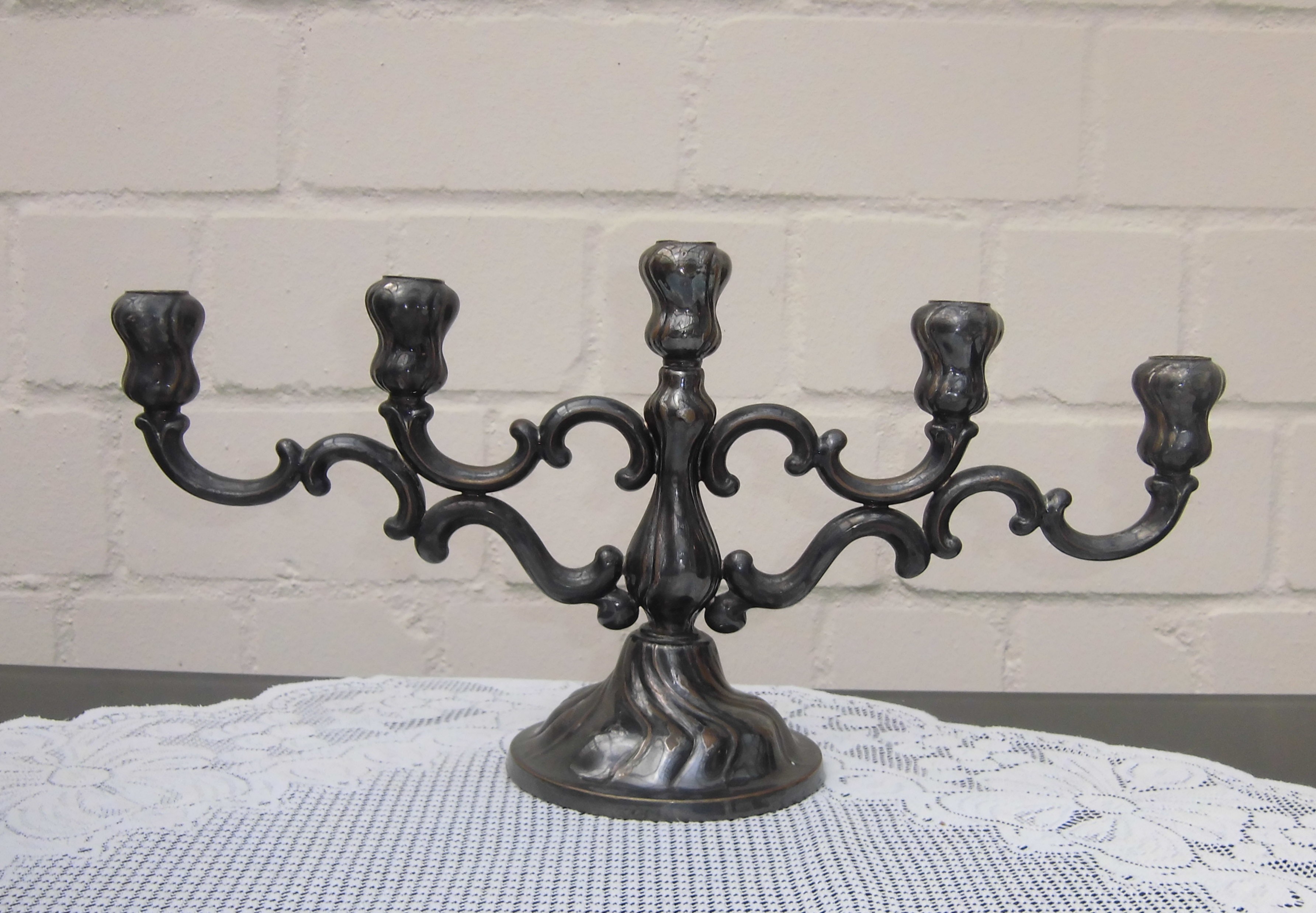 Kerzenleuchter fünfflammig, versilbert, im Chippendale Stile, stark angelaufen, gebraucht, älter, 45 cm breit und 23 cm hoch, der runde Fuß hat einen Durchmesser von 135 cm, mit den Gebrauchspuren der Zeit