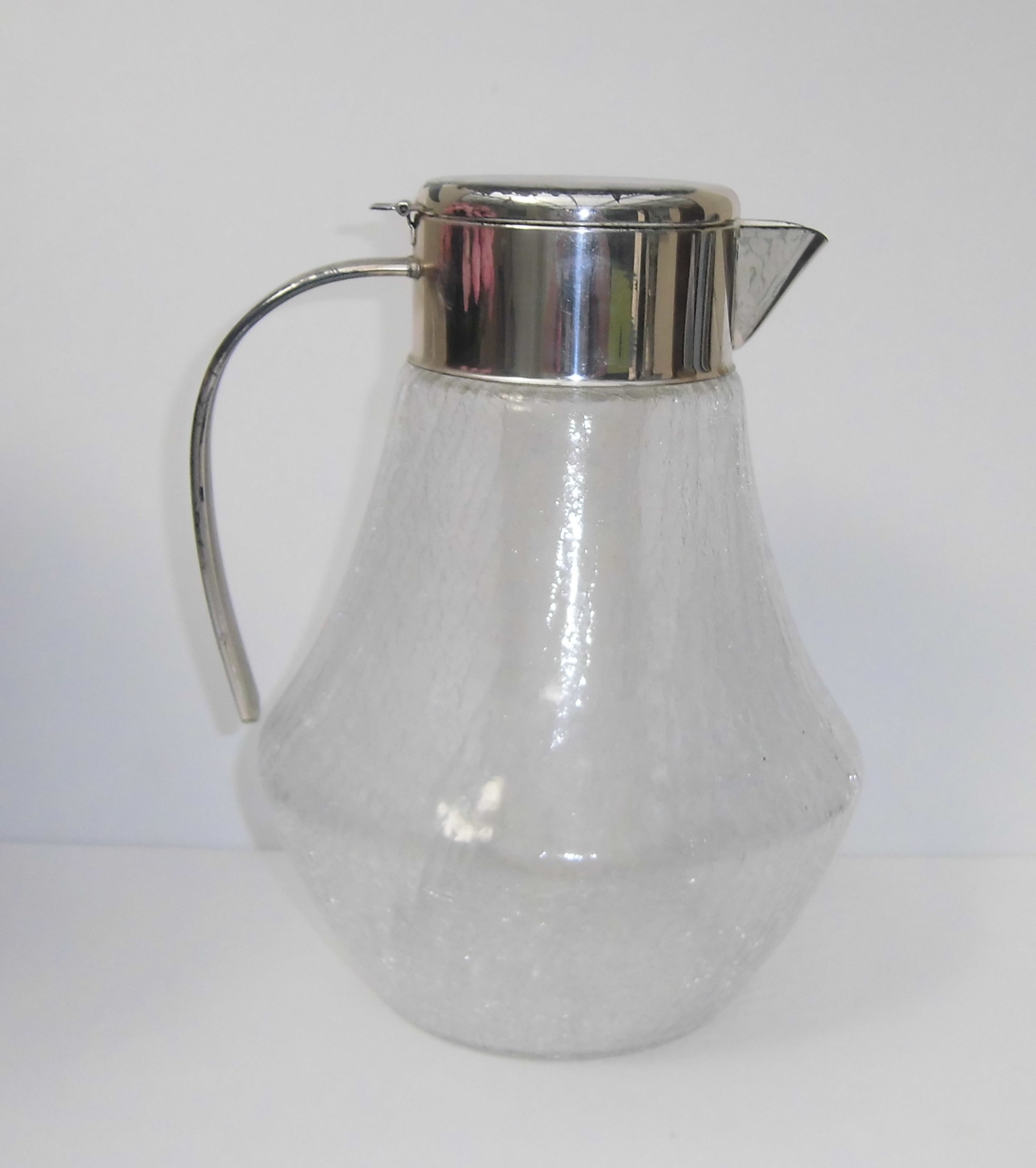 Karaffe Kalte Ente, aus Bruchglas, Deckel und Griff sind versilbert, innen mit Sieb und Glaseinsatz, 27 cm hoch, gebraucht, älter, mit kleinen Gebrauchsspuren wie Abschürfungen an den versilberten Teilen