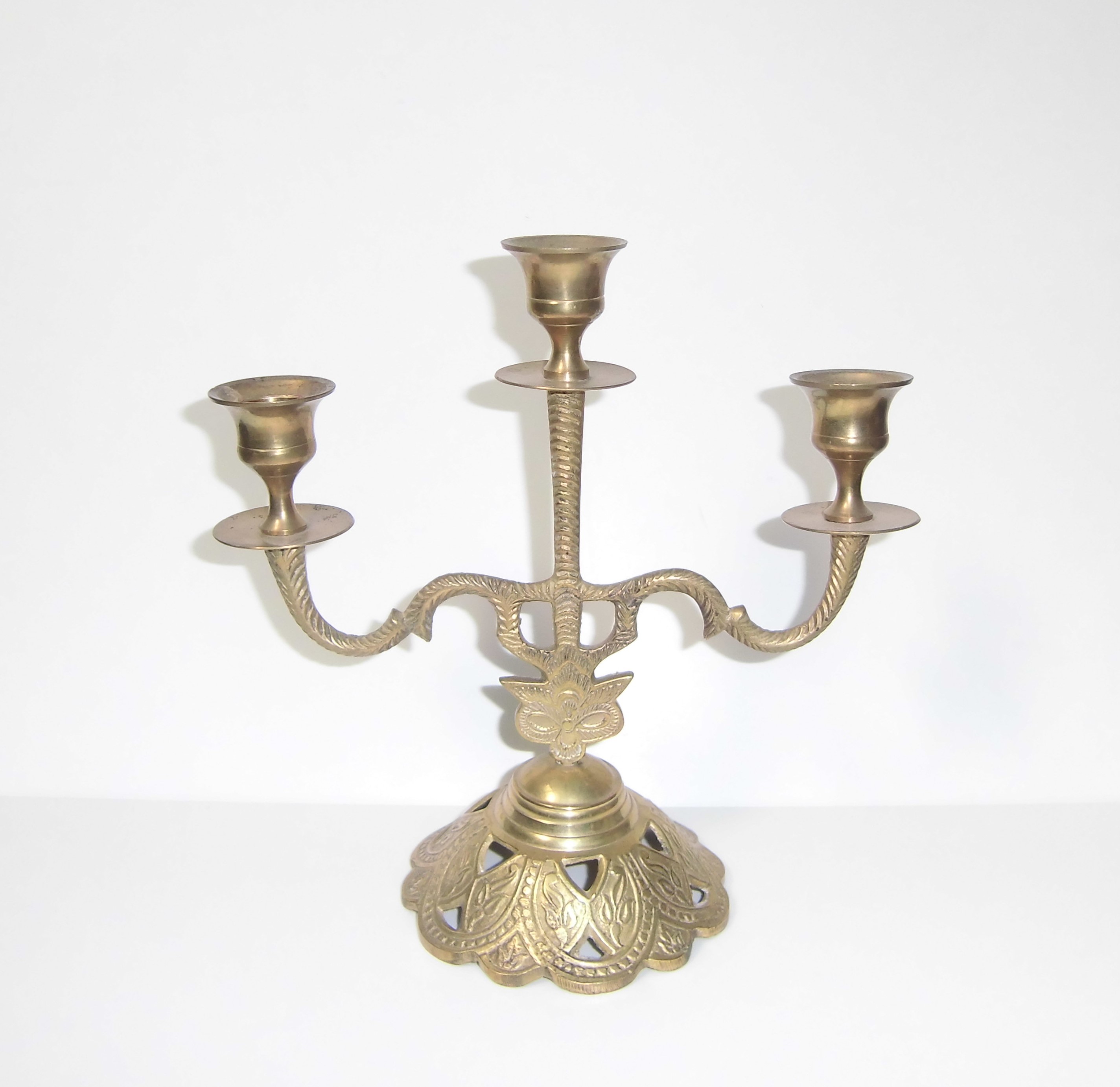 Kerzenleuchter, dreiflammig, Messing, fein verziert, 21 cm hoch, 21 cm breit, gebraucht, älter