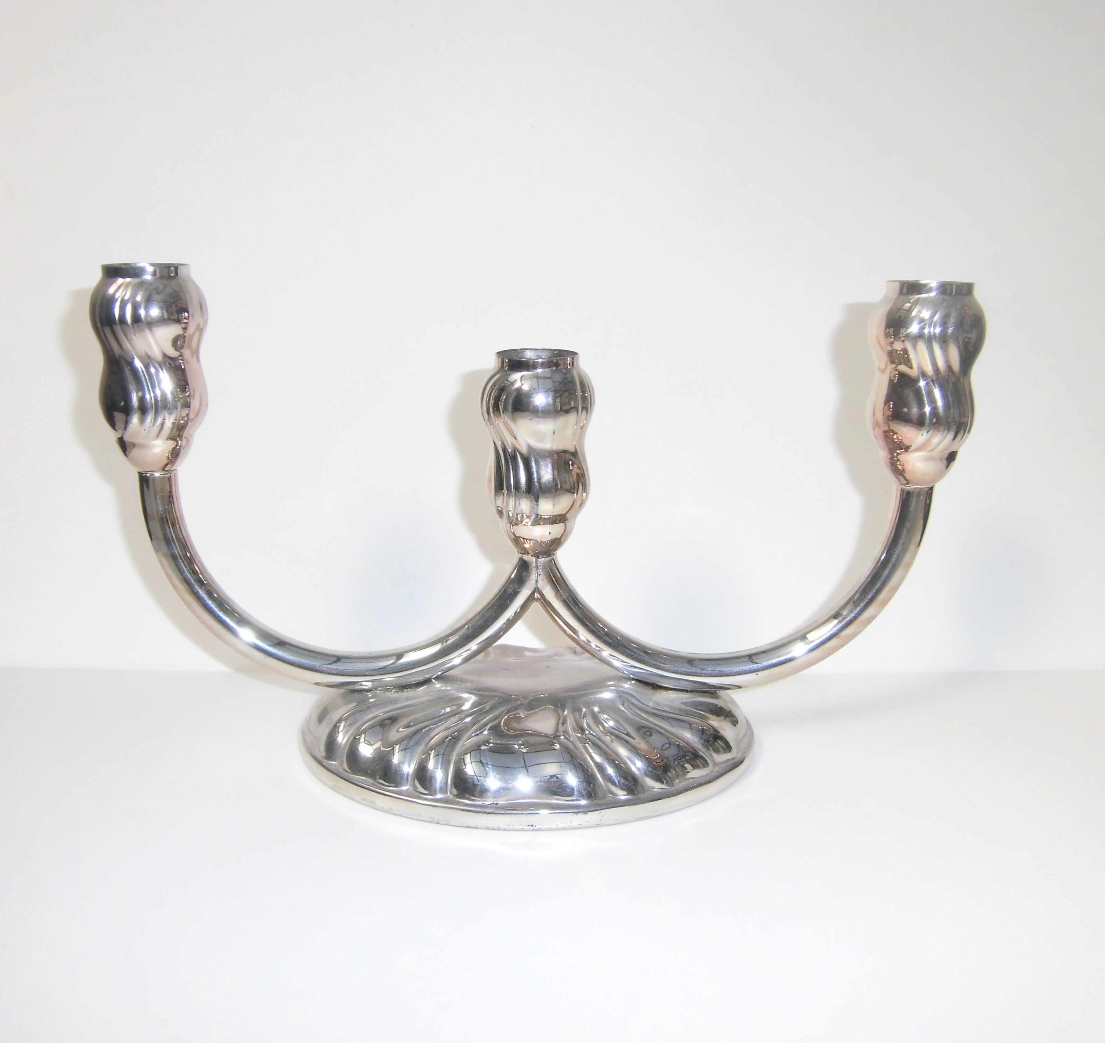 Kerzenleuchter dreiflammig versilbert, Chippendale Stil, 15,5 cm hoch und 25 cm breit, gebraucht, älter, mit kleinen Gebrauchsspuren