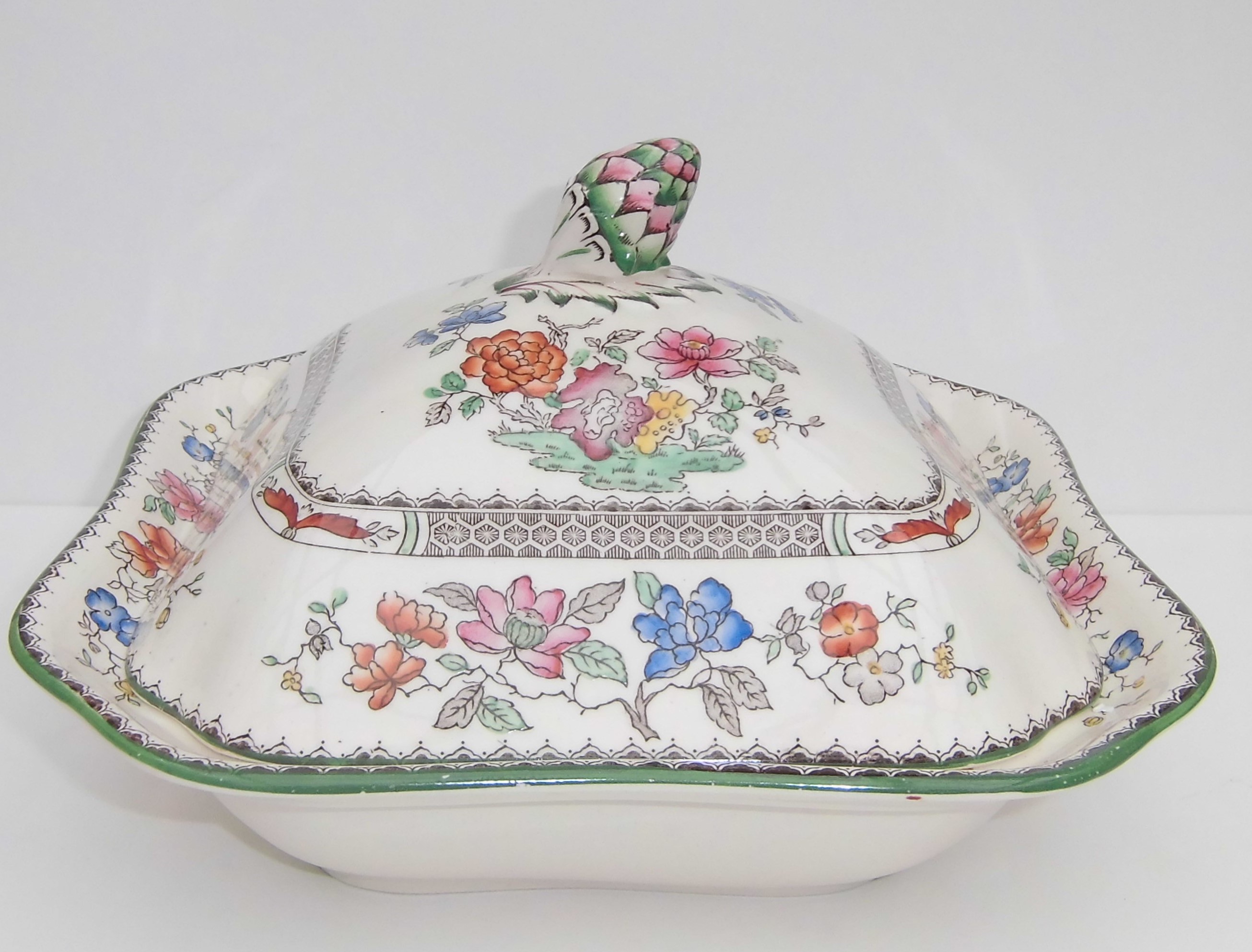 Gemüseschüssel mit Deckel von Copeland Spode Chinese Rose England Nr. 629599, gebraucht, bis auf minimale Gebrauchsspuren am grünen Rand sehr gut erhalten, ohne Beschädigungen