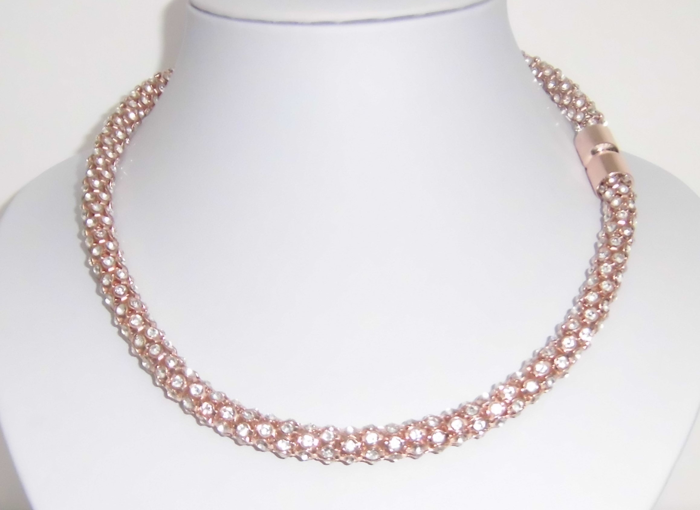 Halskette Collier, Farbe rotgold, rundum mit weißen Kristallen besetzt, 47 cm lang, die Modeschmuckkette hat einen Magnetverschluß