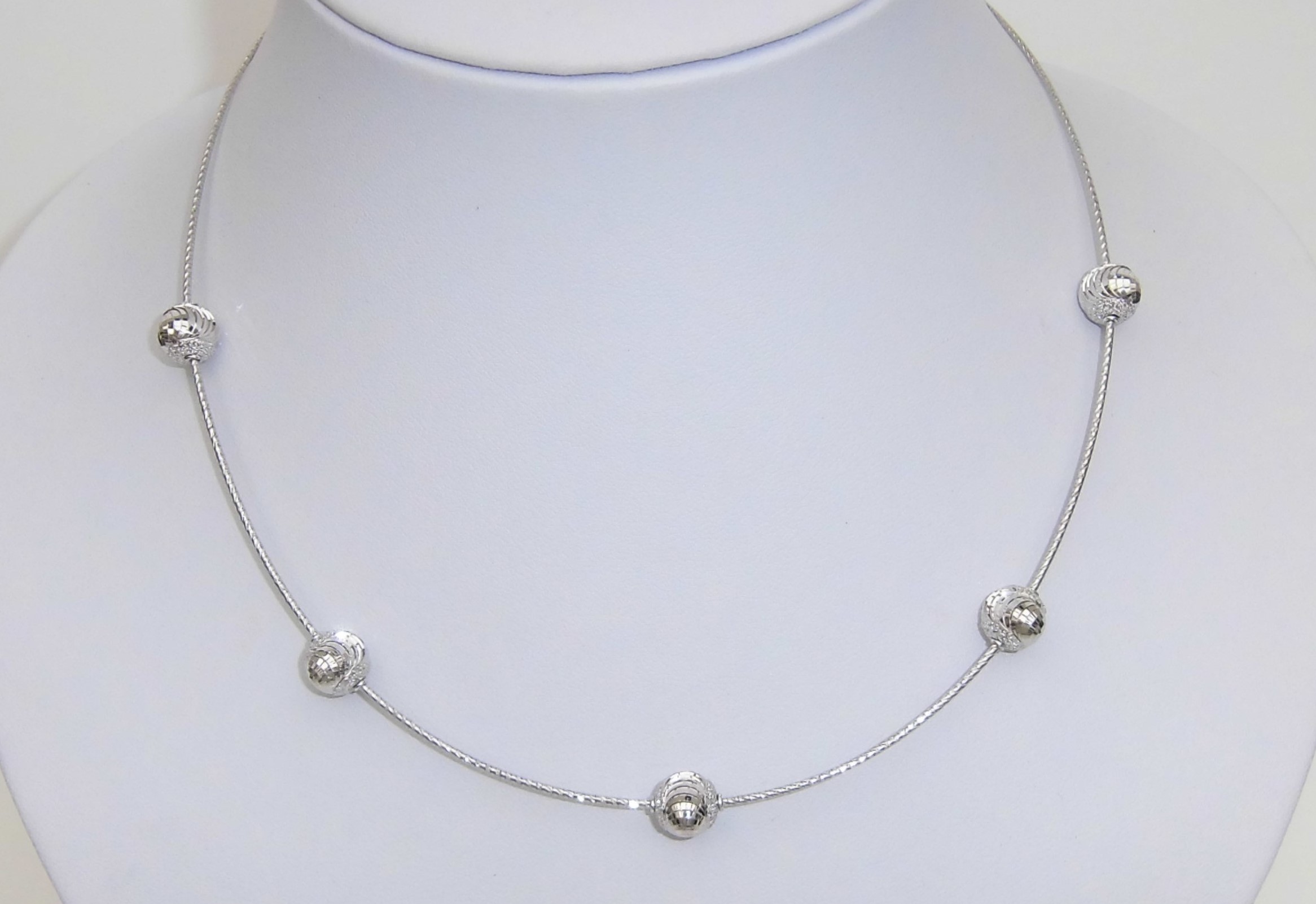 Halskette Collier mit fünf fein verzierten Silberkugeln aus 925 Sterling Silber, die feine Schlangenkette ist 42 cm lang, hat eine Verlängerung von 4 cm und einen Karabinerverschluss, die Kugeln sind ca. 7 mm breit, das Gesamtgewicht beträgt ca. 8,8 g