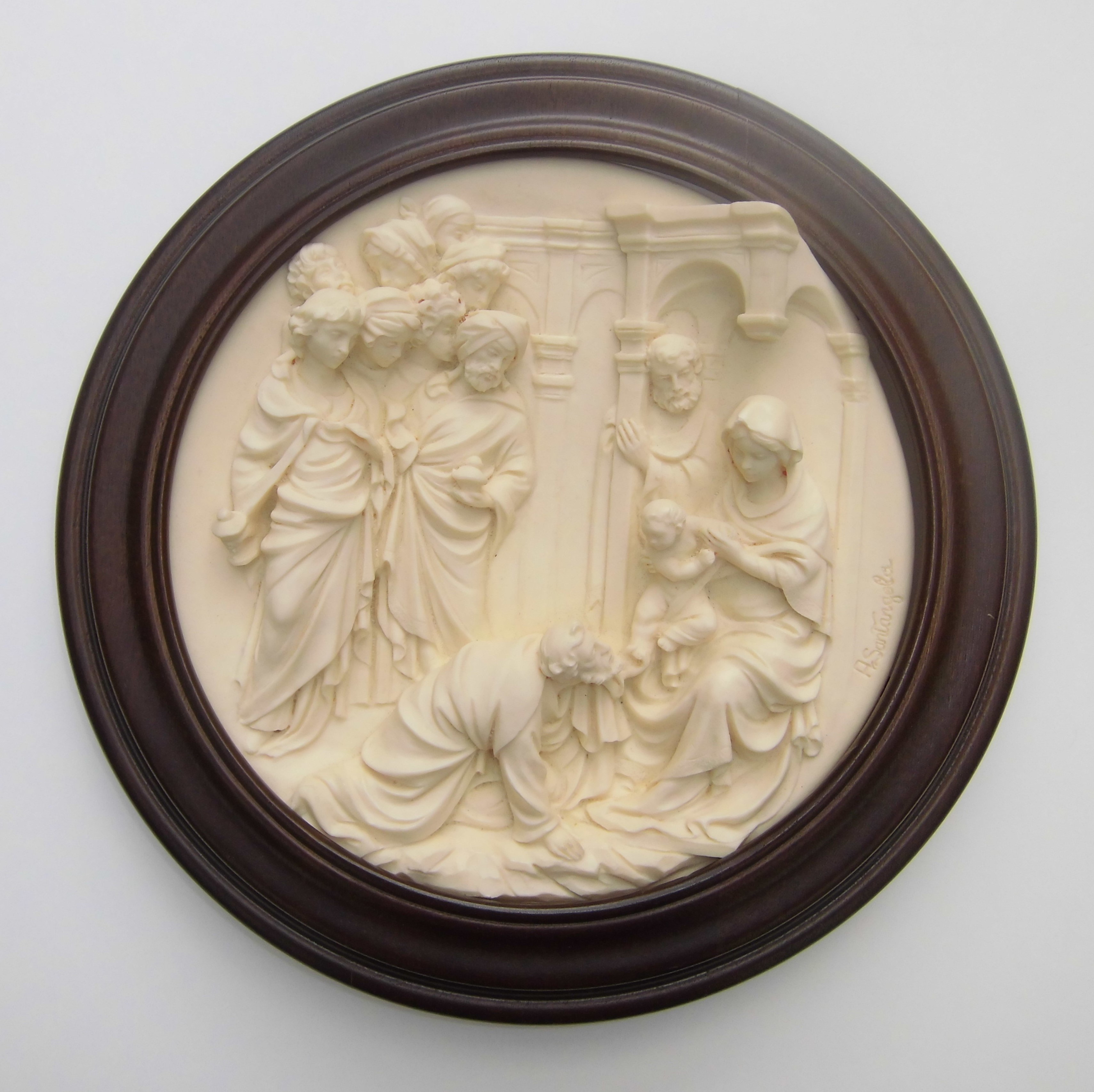 Relief in Form eines Wandtellers des Meisters Alberto Santangela, aus Alabaster, mit Holzrahmen, limitierte Ausgabe aus der L´ADORAZIONE DEI MAGI, Teller Nr. BD 6093, der Teller ist 22 cm und der Holzrahmen 3,2 cm breit, gebraucht, der Holzrahmen hat einen feinen Haarriss s. Foto, auf der Rückseite befindet sich eine ausführliche Beschreibung in italienischer Sprache