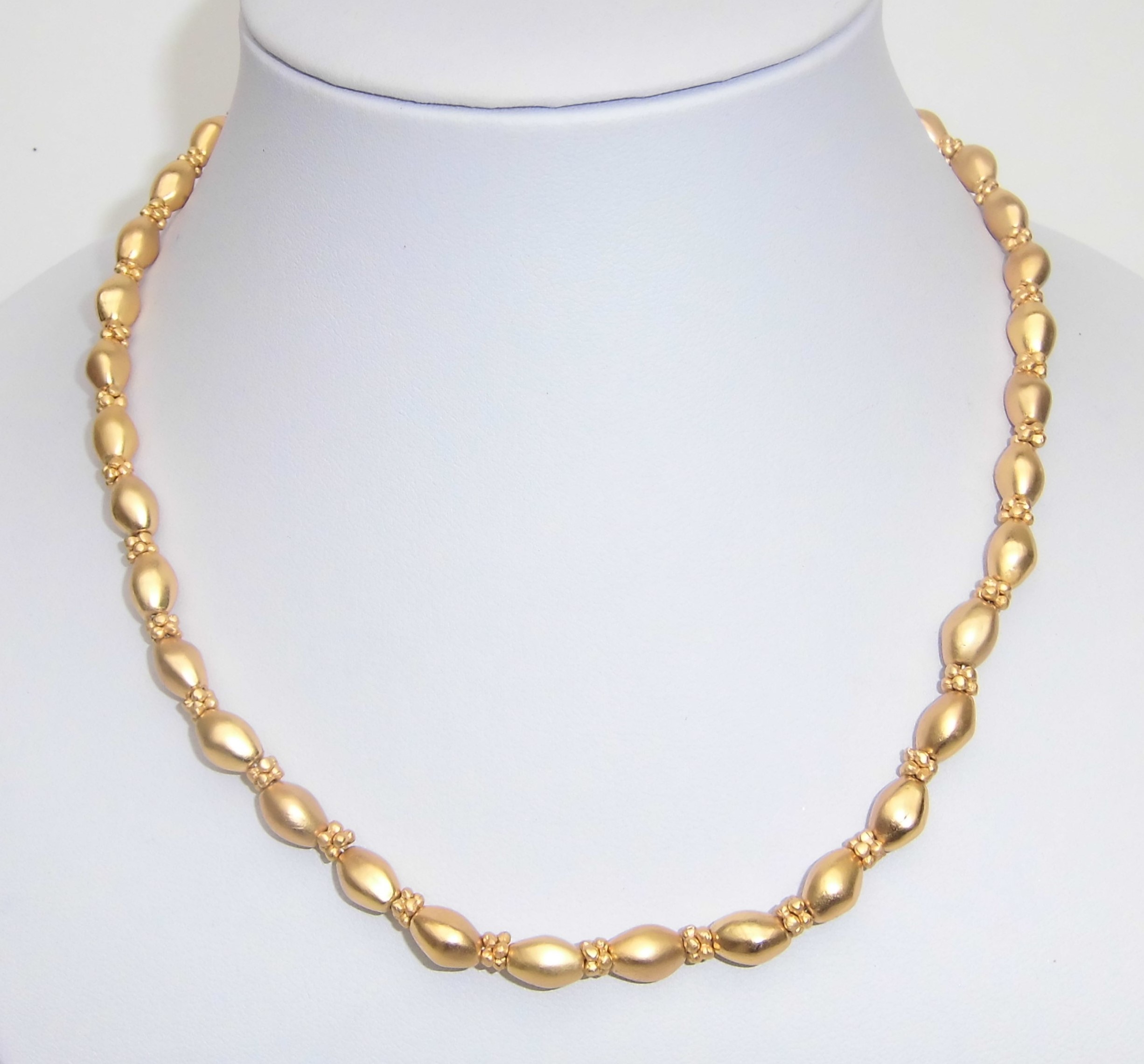 Halskette Collier, vergoldet, 43 cm lang, 44 Gramm schwer, die einzelnen ovalen Perlen sind 9 mm lang und 6 mm breit, die Kette hat einen feinen Karabiner-Verschluß.